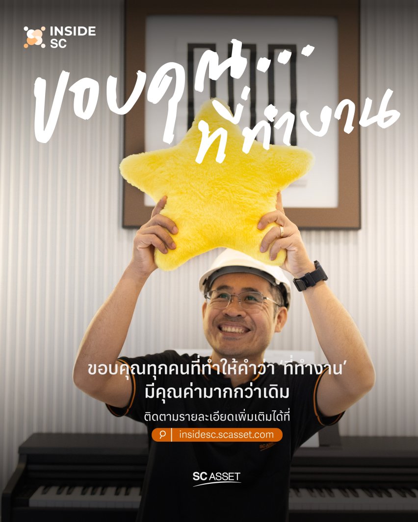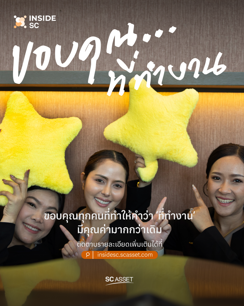 “Inside SC” จึงไม่ใช่แค่แคมเปญ แต่คือการสร้าง Ecosystem การทำงานที่อบอุ่นและเต็มไปด้วยพลังบวก SC Asset เชื่อว่า “คำขอบคุณเล็ก ๆ สามารถสร้างการเปลี่ยนแปลงที่ยิ่งใหญ่ได้” เมื่อพนักงานมีความสุข เขาย่อมส่งต่อความสุขนั้นให้ลูกค้าและสังคมต่อไปได้จริง ๆ ซึ่งสอดคล้องกับวิสัยทัศน์ “For Good Mornings” และแนวคิด “People Thriving” ที่มุ่งสร้างความสุข ความภูมิใจ และความหมายให้กับชีวิตการทำงาน