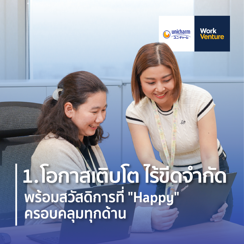 สวัสดิการ 8 Happy: Unicharm มีสวัสดิการที่ครอบคลุมและใส่ใจคุณภาพชีวิตพนักงานในทุกมิติ โดยยึดหลัก 8 Happy (เช่น Happy Body, Happy Heart, Happy Money, Happy Family) ซึ่งทั้งหมดนี้ สะท้อนถึงความมุ่งมั่นในการสร้างคุณภาพชีวิตและสังคมของพนักงานอย่างยั่งยืน และที่สําคัญ: ผลตอบแทนเติบโตไปพร้อมกับความสามารถ และผลงานอย่างเป็นธรรม ไม่จํากัดระยะเวลา หากพิสูจน์ได้ว่ามีศักยภาพ