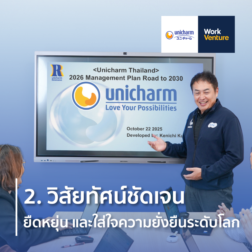 ในยุคที่คนรุ่นใหม่มองหา "ความหมาย" ของการทํางาน และองค์กรที่ใส่ใจ "ผู้คน" คือ จุดหมายปลายทางที่แท้จริง! คุณเคยสงสัยไหมว่าบริษัทแบบไหนที่ครองใจ Young Talent ได้อย่างต่อเนื่อง? วันนี้ WorkVenture ขออาสาพาไปไขปริศนาที่ Unicharm Thailand ผู้นําผลิตภัณฑ์เพื่อสุขอนามัยในชีวิตประจําวัน ที่ไม่ได้มีดีแค่สินค้าที่ติดตลาด แต่ยังโดดเด่นในฐานะองค์กรที่ถูกเลือกให้อยู่ในลิสต์บริษัทที่คนรุ่นใหม่อยากทํางานด้วยมากที่สุดถึง 4 ปีซ้อน!
