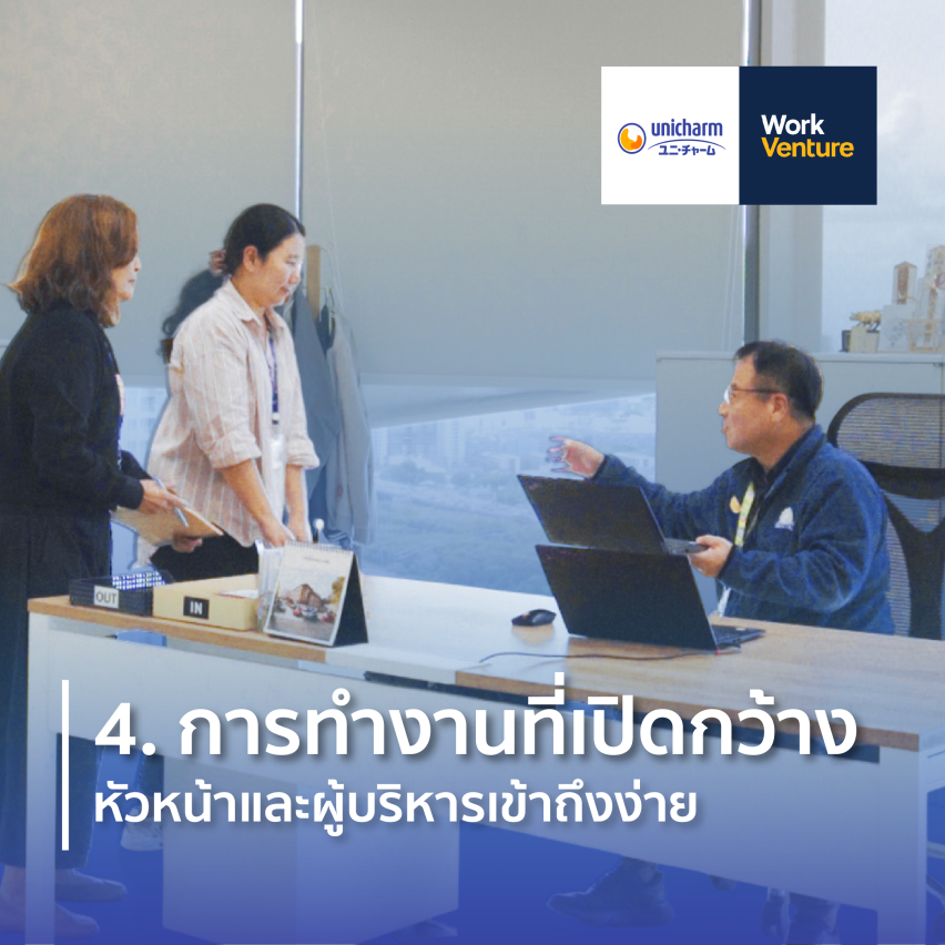 สําหรับคนรุ่นใหม่ที่ไม่อยากทํางานแบบมีกําแพงกั้นระหว่างพนักงานและผู้บริหาร Unicharm ตอบโจทย์ได้อย่างดีเยี่ยม! ที่นี่ใช้แนวคิด “Management with Resonance” ซึ่งเป็นมากกว่าแค่การสื่อสาร แต่เป็นการ “สั่นพ้อง” กันระหว่างผู้บริหาร/หัวหน้า กับพนักงานหน้างาน เพื่อให้เกิดความเข้าใจในมุมมองของผู้บริหาร และผู้บริหารเองก็ได้เข้าใจ “เสียงจากหน้างาน” อย่างแท้จริง