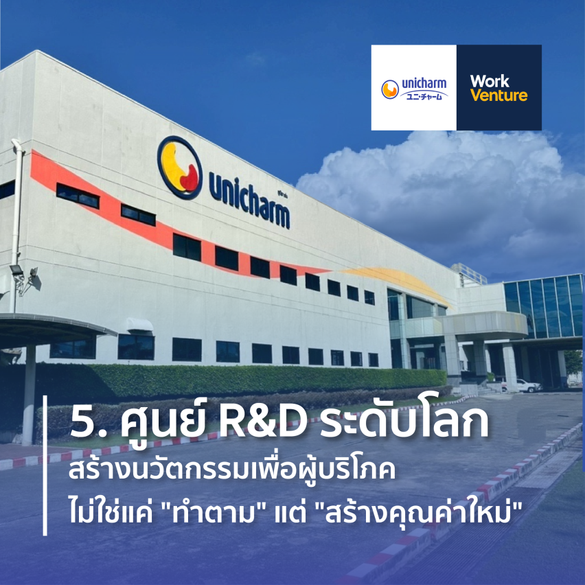 โอกาสทองสำหรับ R&D: พนักงานสาย R&D ที่ Unicharm Thailand คุณจะมีโอกาสเชื่อมโยงความรู้และเทคโนโลยีระดับโลกจากสํานักงานใหญ่ ประเทศญี่ปุ่น เพื่อนำมาพัฒนาผลิตภัณฑ์ให้เข้ากับความต้องการของผู้บริโภคในแต่ละท้องถิ่น ถือเป็นโอกาสทองในการเรียนรู้และเติบโตเป็นนักพัฒนาผลิตภัณฑ์ที่เข้าใจทั้งเทคโนโลยีและพฤติกรรมผู้บริโภคอย่างรอบด้าน