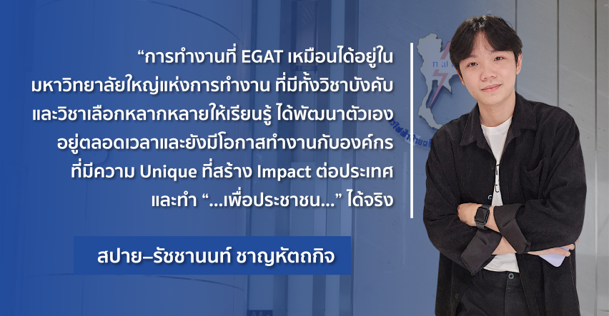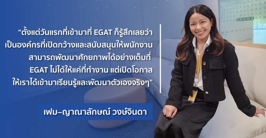 “ตั้งแต่วันแรกที่เข้ามาที่ EGAT ก็รู้สึกเลยว่าเป็นองค์กรที่เปิดกว้างและสนับสนุนให้พนักงานสามารถพัฒนาศักยภาพได้อย่างเต็มที่ EGAT ไม่ได้ให้แค่ที่ทำงาน แต่เปิดโอกาสให้เราได้เข้ามาเรียนรู้และพัฒนาตัวเองจริงๆ”