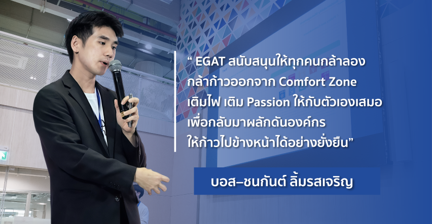 บอสเล่าว่า EGAT เป็นองค์กรที่มอบโอกาสให้เติบโตจริง ทั้งด้านความมั่นคง สวัสดิการ และเส้นทางพัฒนาตัวเอง “ EGAT สนับสนุนให้ทุกคนกล้าลอง กล้าก้าวออกจาก Comfort Zone เติมไฟ เติม Passion ให้กับตัวเองเสมอ เพื่อกลับมาผลักดันองค์กรให้ก้าวไปข้างหน้าได้อย่างยั่งยืน”