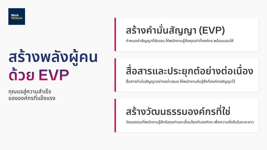 ในทางตรงข้าม องค์กรที่มี EVP ที่แข็งแรงและสื่อสารได้อย่างต่อเนื่อง จะสามารถสร้างการรับรู้ที่ชัดเจนทั้งภายในและภายนอก พนักงานรู้สึกมั่นใจว่าองค์กรเข้าใจเขา และพร้อมจะพัฒนาไปด้วยกัน