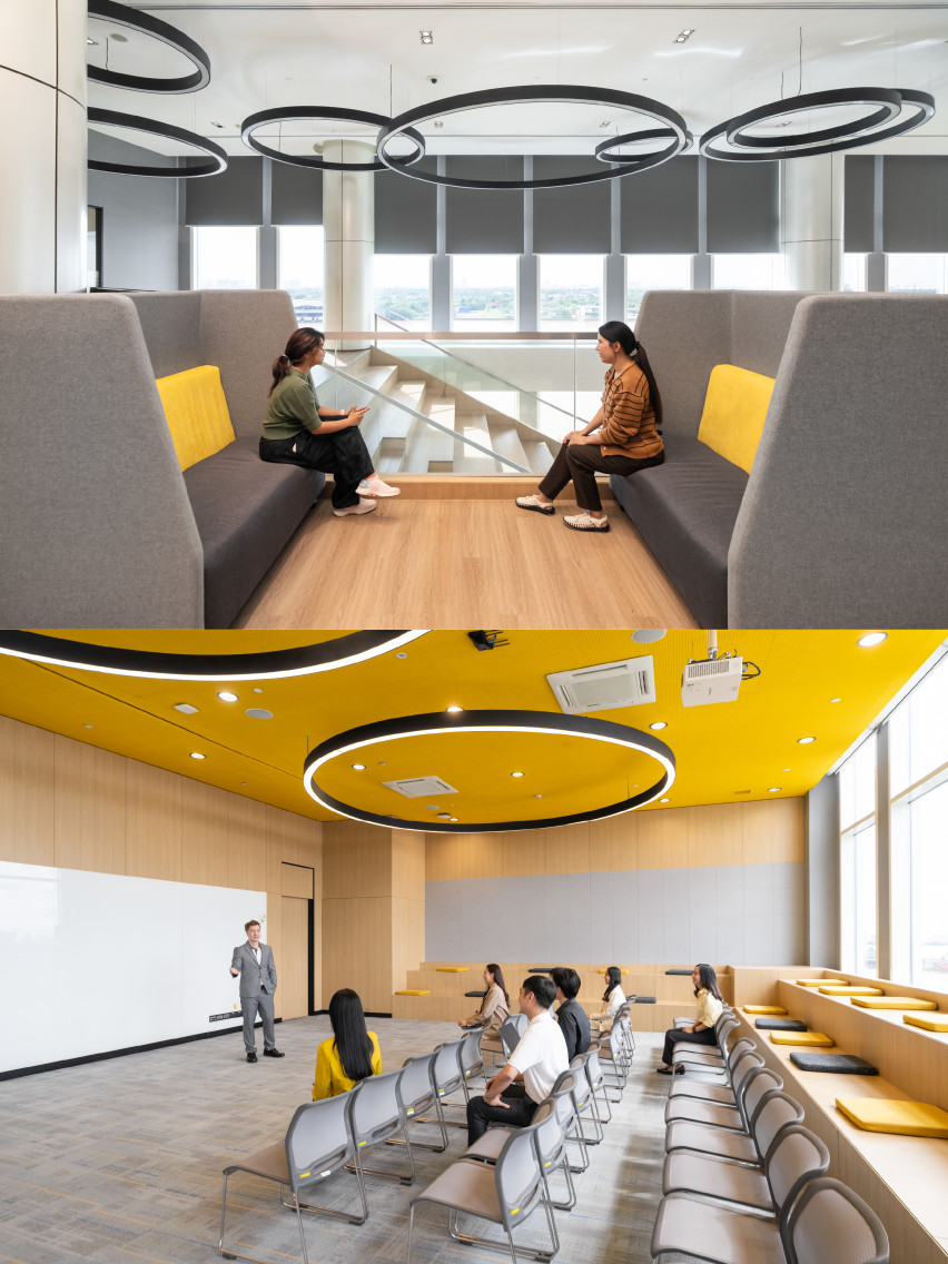 และนอกจากนี้ยังมี Learning Space และ Co-working Space ที่บริเวณชั้น 5–6 พื้นที่ที่ให้พนักงานทุกคนมาน้่งทำงาน แลกเปลี่ยนไอเดีย และเรียนรู้สิ่งใหม่ ๆ ได้ตลอดทั้งวัน ที่ชั้น 5 มีบันไดโปร่งกลางโถงยังเชื่อมต่อไปยังชั้น 6 ที่เปิดรับแสงธรรมชาติผ่านกระจกบานใหญ่ พร้อมวิวเเม่น้ำเจ้าพระยา ทำให้ทุกครั้งที่มาที่นี่ ชาว Krungsri จะได้พบกับบรรยากาศที่เติมเต็มพลังใจอยู่เสมอ