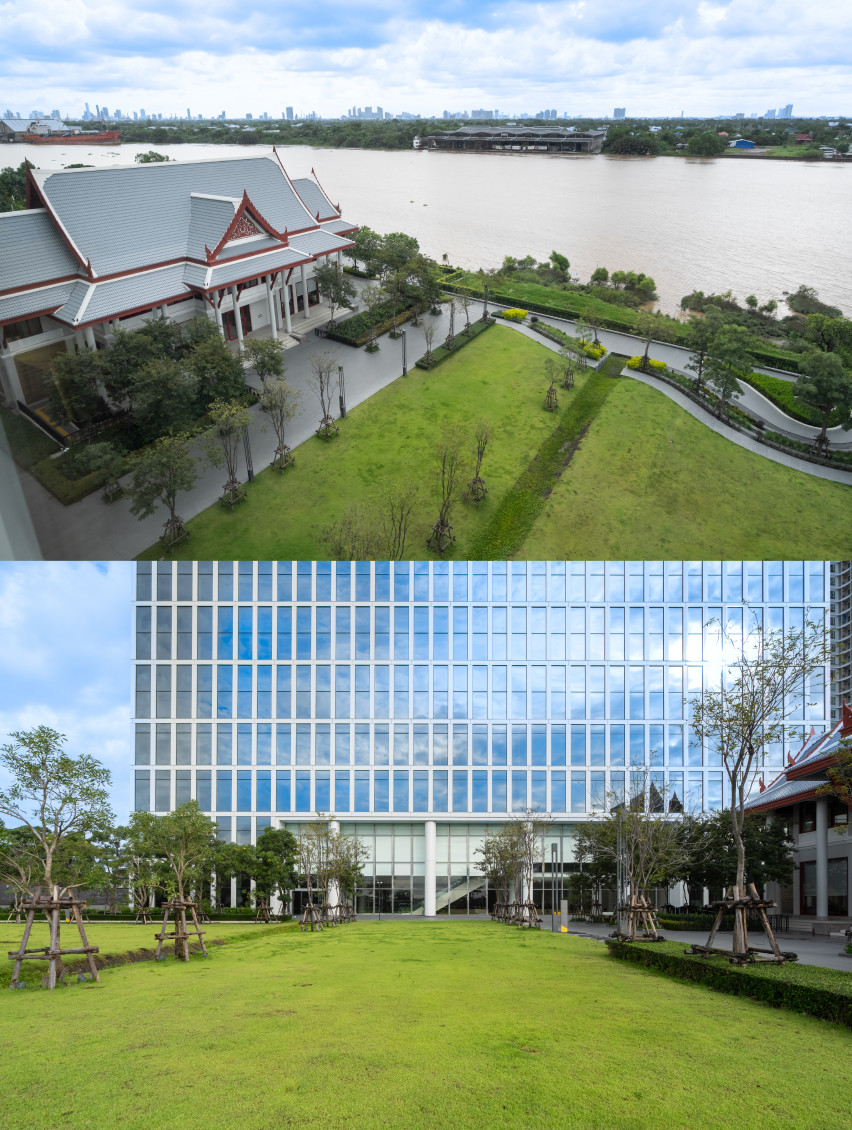 ถัดจากตึกริมน้ำออกมาคือพื้นที่สีเขียวกว้างขวางที่ทอดตัวไปจนถึงริมแม่น้ำเจ้าพระยา ที่มีอาคารเรือนไทยที่งดงามด้วยสถาปัตยกรรมไทยแบบดั้งเดิมตั้งอยู่ ให้บรรยากาศที่สงบและสดชื่น เหมาะสำหรับการพักผ่อนเติมทั้งพลังใจและสมาธิระหว่างวัน เพื่อให้กลับไปทำงานต่อได้อย่างสดใสกว่าเดิม